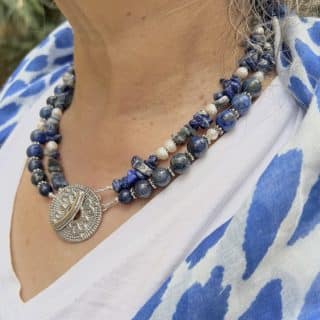 Sodalite & cultured freshwater pearls, with Fatima’s hand