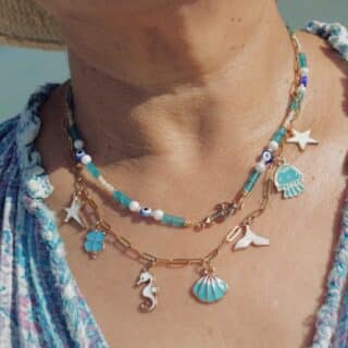 Summer necklace set, 1st gold filled chain necklace with twin fish pendant, 2nd rose & blue quartz necklace with colorful charms