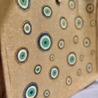 “Boho-chic jute tote adorned with colorful evil eye motifs in vibrant blues and turquoise – a stylish blend of natural texture and protective symbolism for everyday carry.“