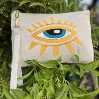 Vibrant clutch with embroidered yellow eye and radiating sun rays. Bold blue iris creates stunning contrast for a mystical statement piece.
