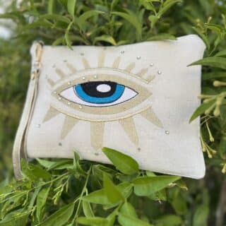 Elegant neutral clutch featuring embroidered eye in warm gold threading, accented with delicate pearls for luxurious celestial charm.
