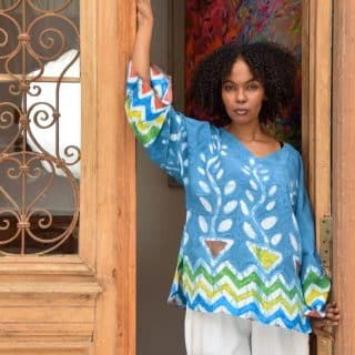بلوزة زرع نوبي .( بلوزة بكم مستوحاه من الفن النوبى مرسومة ومصبوغة يدويا بطريقة الباتيك ، بصبغات صديقة للبيئة ،ثابته ، وقماش طبيعي ..i takes 2 weeks