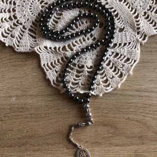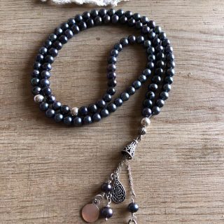 سبحة يدوية من لؤلؤ أسود وفواصل فضة ٩٢٥، بتعليقة “ماشاء الله”.