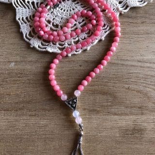Handcrafted with rosy pink rhodochrosite stones and original 925 silver details, this rosary feels uplifting and heartfelt.