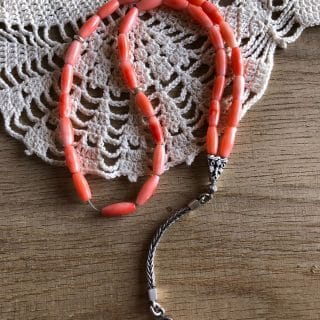 سبحة يدوي معمولة من ٣٣ حجر مرجان وردي طبيعي، ومعاها فواصل من فضة 925، وتعليقة فضية بيضاوية مكتوب عليها ختم النبوة – قطعة روحانية وأنيقة جدًا.