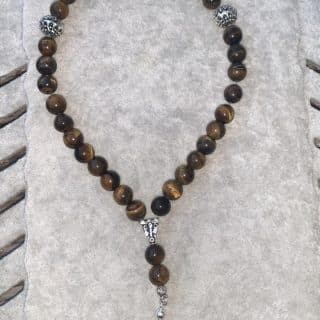 A 925 silver rosary with Tiger Eye beads, finished with three fine chains ending in small mirror-like balls. A refined and stylish piece.