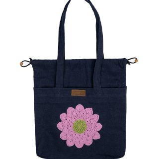Indigo Tote bag with 2 large outer pockets and a small inner pocket.