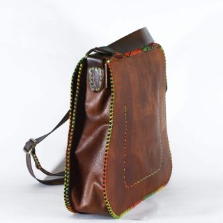 This colorful satchel has a unique shape that is at once beautiful and unusual.