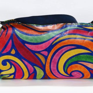 A geometric cross-body bag , that can also act as a handbag, with colorful Swirly design…
