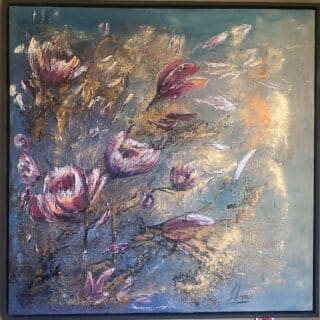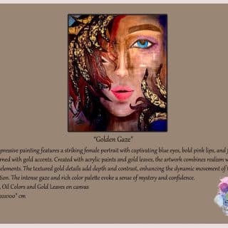 – This expressive painting features a striking female portrait with captivating blue eyes, bold pink lips, and flowing hair adorned with gold accents. Created with acrylic and oil paints and gold leaves, the artwork combines realism with abstract elements.