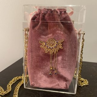 The Bois De Rose Crystal Plexi Box, designed in an Acrylic Plexi Box Skeleton , with inside Velvet Tailored Pull-string Pouch with satin inside-lining, & our signature Gold-Plated Piece embedded with purple stones, by CH by Christine Habib Azer.