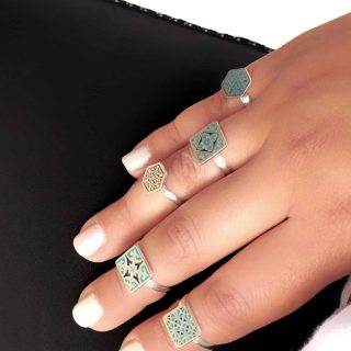 Sterling silver ring etched with unique patterns with colored black enamel. The ring size is adjustable.