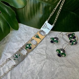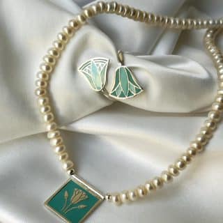 Sterling Silver Double Sided hand painted pendant with natural pearls Necklace. One side with a beautiful geometric pattern and the other side a cute bird.