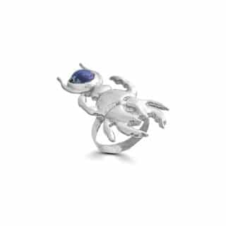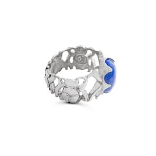 Pharaonic Collection, Lotus With Oval Lapis Stone, Sterling Silver, Platinum Plated Ring