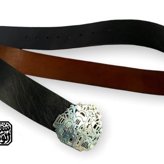 Genuine leather double face belt with a sterling silver buckle featuring A Nubian village