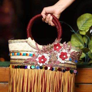 A bag made of natural, environmentally friendly reinforced wicker. It is lined on the inside and has a long handle, completely embroidered by hand with natural linen threads and natural colored burlap. The bag is spacious on the inside, suitable for the beach, shopping, club, travel, and gym. It is completely dyed in a very trendy golden color.