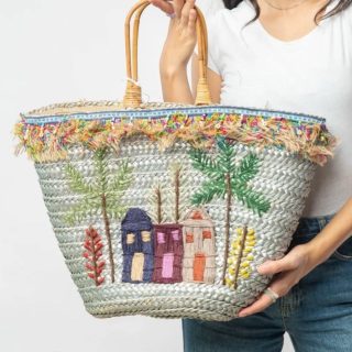 A bag made of natural, environmentally friendly reinforced wicker. It is lined from the inside and has a handle made of bamboo wood. It is completely hand-embroidered with natural linen threads in the shapes of Nubian houses and embroidered with colored natural burlap. The bag is spacious and suitable for daily use, the sea, travel, the gym, or shopping.