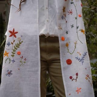 Pure linen beige shawl, hand embroidered with colorful floral pattern