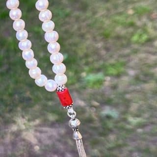 One of kind 33 Sebha, pearl, coral, sterling silver tassel, great gift for Ramadan Iftar invitation