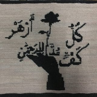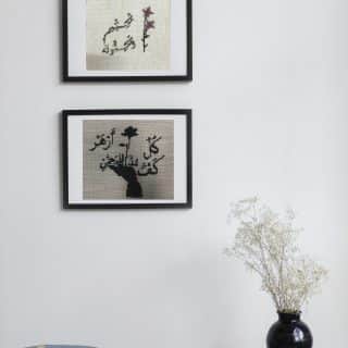 This delicate needlepoint embroidery features a beautifully stylized Arabic calligraphy design alongside an elegant floral motif. The minimalist yet expressive composition captures the essence of traditional craftsmanship with a contemporary touch. The earthy brown calligraphy contrasts softly with the gentle pink flowers, creating a balanced and soothing visual appeal. This piece is a celebration of art, language, and nature, perfect for adding a subtle cultural charm to any space.