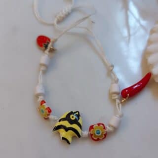 Anklet made of multicolour seashell stones in square and round shapes with 3 unique pendants in the shape of fish