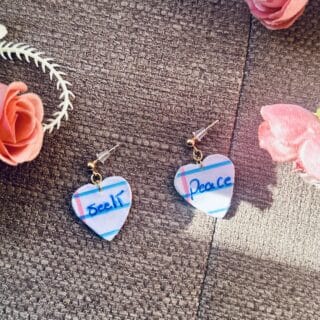 Heart shaped ceramic earrings, styled like a page from a notebook with sweet handwritten words.