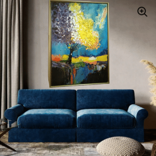 – This expressive painting features a striking female portrait with captivating blue eyes, bold pink lips, and flowing hair adorned with gold accents. Created with acrylic and oil paints and gold leaves, the artwork combines realism with abstract elements.