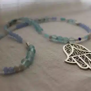 Elegant handmade necklace with baby blue stones and wide dangling silver charm