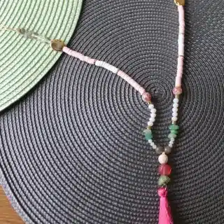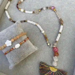 Handmade Necklace with touch of golden rings mixed with eledgant stones and dangling summer color strips