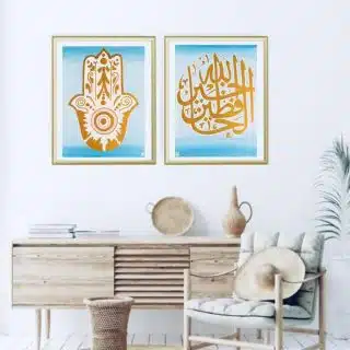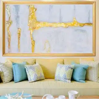 Two acrylic paintings with gold leafs framed by modern gold frame .