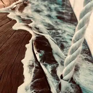 Hanged shelf,, made of natural raw wood ,, blue & tiffany waves design with epoxy resin,, white ropes and black steel hangers