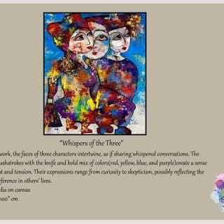 In this artwork, the faces of three characters intertwine, as if sharing whispered conversations. The dynamic brushstrokes with the knife and bold mix of colors (red, yellow, blue, and purple) create a sense of movement and tension.