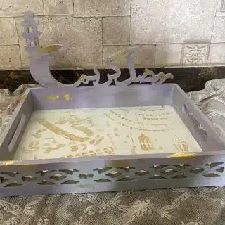 Set of 4 foldable tables with stand in vintage beige mandala design with touch of metallic blue