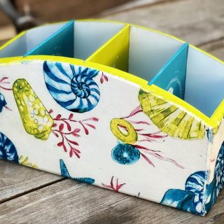 Wooden Cutlery Organizer with summer wheel design and colorful pattern blue x yellow