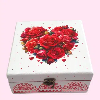 A beautiful gift box decorated with cheerful hearts and flowers in white and red colors.