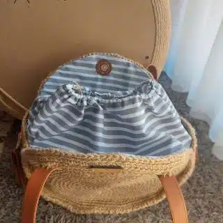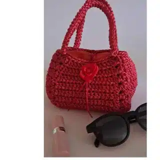 Handmade Crochet bag, made of pure off white cotton yarn mixed with pure leather Havan circles and pure leather handles, Dimensions 40 x 35 cm, Inner lining with pocket and zipper