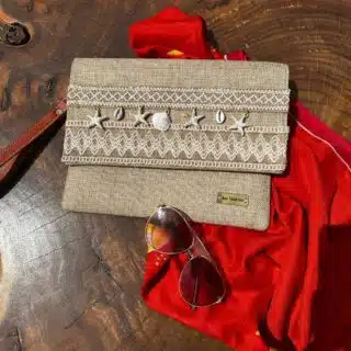 Beige beach clutch with a central olive strap having starfish and shell charms