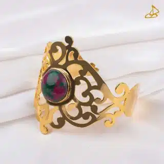 مصنوع يدويًا من النحاس المطلي بالذهب، ومُزين بأحجار العقيق الخضراء.
