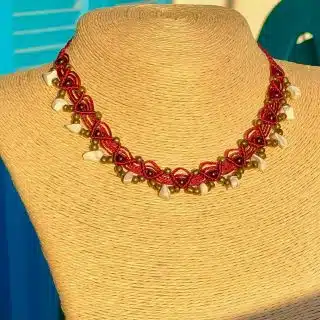 A handmade choker created by Burgundy cords mixed with brass and Howlite crystal stones.