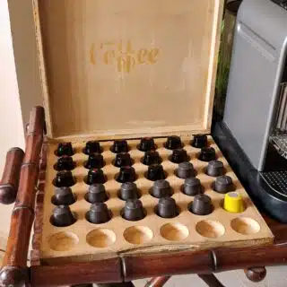 Wooden box for tea and coffee in black and white tiles with touch of yellow