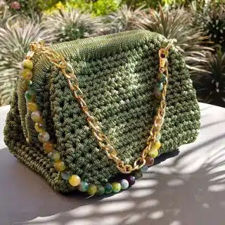 Olive colored Crochet clutch/bag with a double handle. A golden chain handle and a lovely beaded chain handle matching the bag’s color.A perfect choice for afternoon outings