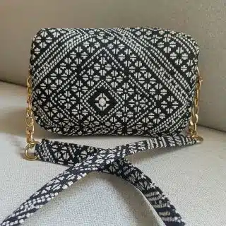 This handcrafted clutch is a blend of modern design and timeless craftsmanship. Made with meticulous punch needle embroidery using luxurious sirma threads, it features a bold geometric pattern in black and steel blue. The textured surface adds a unique tactile feel, while the high-quality chain strap ensures durability and style.