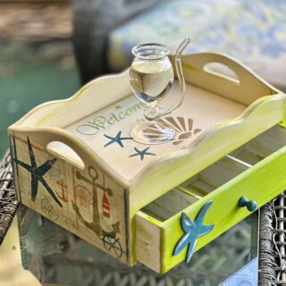 A handmade wooden tray with a built-in drawer, perfect for storing tea bags, napkins or small essentials.