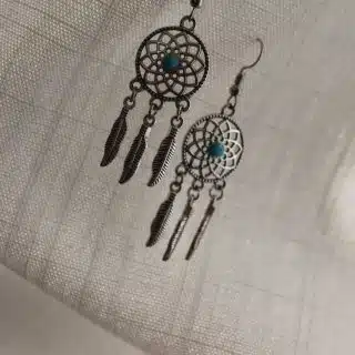 Silver DreamCatcher Earrings with hook back, with turquoise and feather dangle accents