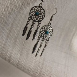 Silver DreamCatcher Earrings with hook back, with turquoise and feather dangle accents