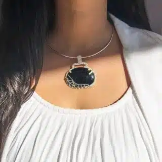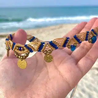 A Handmade adjustable choker created with Tourmaline stones and Brass on the sides woven by Beige and Navy cords.