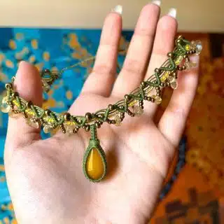 A Handmade adjustable necklace created with Citrine crystal and brass woven by olive cords and citrine stones on the sides.