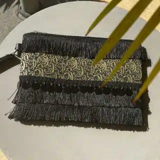 Large sturdy black clutch 22*30 cm made with high quality linen fabric, and leather back. With a catchy golden calligraphy and layered black fringes. Notice the lovely large black sequin. Spacious with inside pocket .