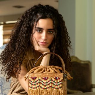(Bonbon) Bag in beige python skin is hand-embellished by skittles beads & diamonds..so each unique piece may vary slightly from the next.