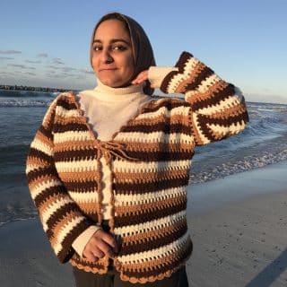 The ‘Dune’ Cardigan is a cozy and stylish piece, featuring a vibrant striped pattern in warm sunset hues. Hand-crocheted with love, it’s perfect for adding a touch of boho chic to your fall wardrobe